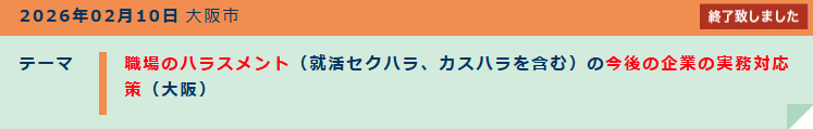 | 講座名 | 職場のハラスメント(就活セクハラ、カスハラを含む)の今後の企業の実務対応策(大阪) |