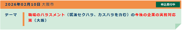 | 講座名 | 職場のハラスメント(就活セクハラ、カスハラを含む)の今後の企業の実務対応策(大阪) |